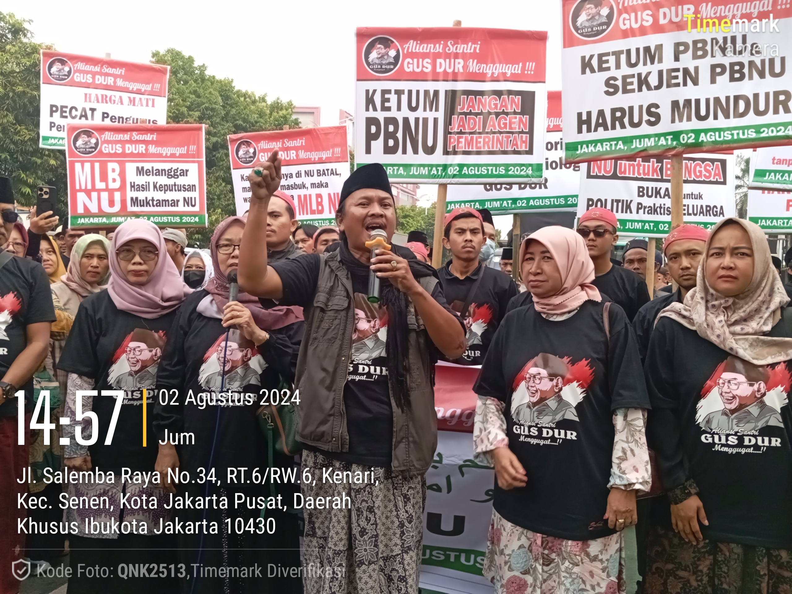 Aliansi Santri Gus Dur Menggugat, hari ini, 2 Agustus 2024 menggelar aksi unjuk rasa di depan Kantor Pengurus Besar Nahdlatul Ulama (PBNU), Jalan Kramat Raya, Jakarta. Hal ini kami lakukan dikarenakan rasa peduli dan bentuk kecintaan sekaligus rasa keprihatian kami sebagai Santri Gus Dur yang tergabung dalam Aliansi Santri Gus Dur Menggugat.