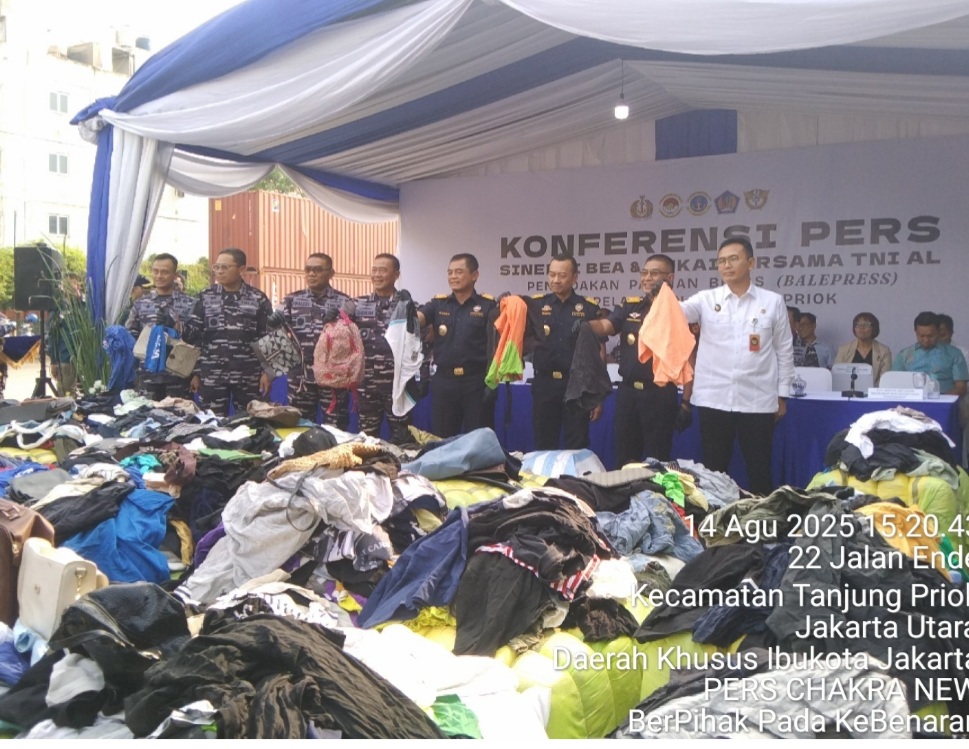 CHAKRANEWS.MY.ID. JAKARTA,- 14 Agustus 2025 –,Bea Cukai Tanjung Priok bersama TNI Angkatan Laut gagalkan pemasukan peti kemas bermuatan Ballpress ( pakaian dan tas bekas ) di wilayah pelabuhan Tanjung Priok, Penindakan ini di lakukan pada Sabtu ( 09/08 ) hingga Selasa ( 12/8 ) di tiga lokasi strategis, yaitu Kade Domestik 212 ( Lokasi Pembongkaran barang ), Alat pemindai Impor TPS TER3 ( Lokasi Pemindaian ), dan TPS CDC Banda ( Lokasi penimbunan dan pemeriksaan barang ).