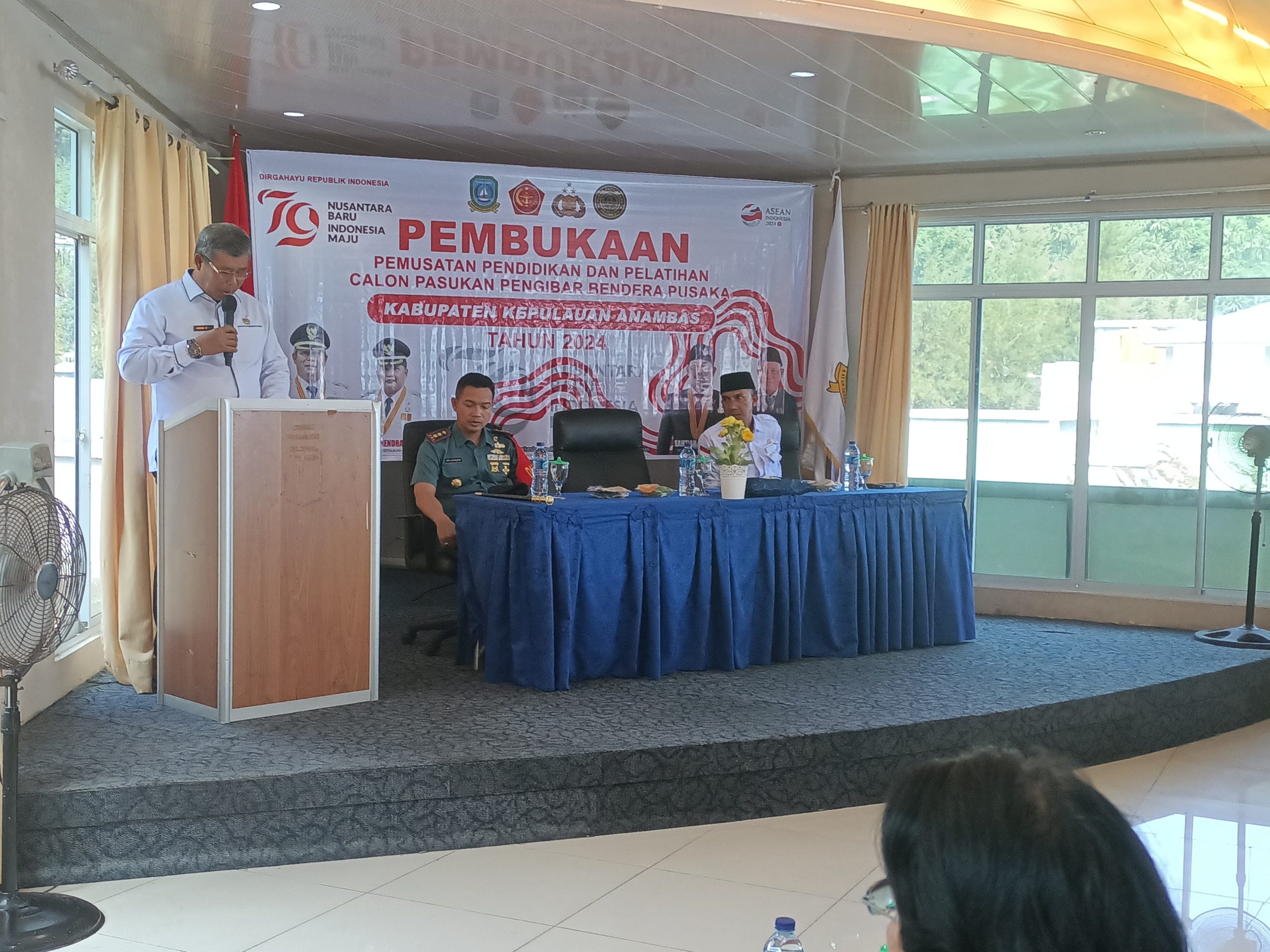 Komandan Pangkalan TNI AL Tarempa Letkol Laut (P) Ari Sukamana, S.E., M.Tr. Opsla., menghadiri acara Pembukaan Pemusatan Pendidikan dan Pelatihan Calon Pasukan Pengibar Bendera Pusaka Kabupaten Kepulauan Anambas Tahun 2024, bertempat di Aula Gedung Tarempa Beach, Kecamatan Siantan, Kabupaten Kepulauan Anambas, Rabu (31/07/2024).