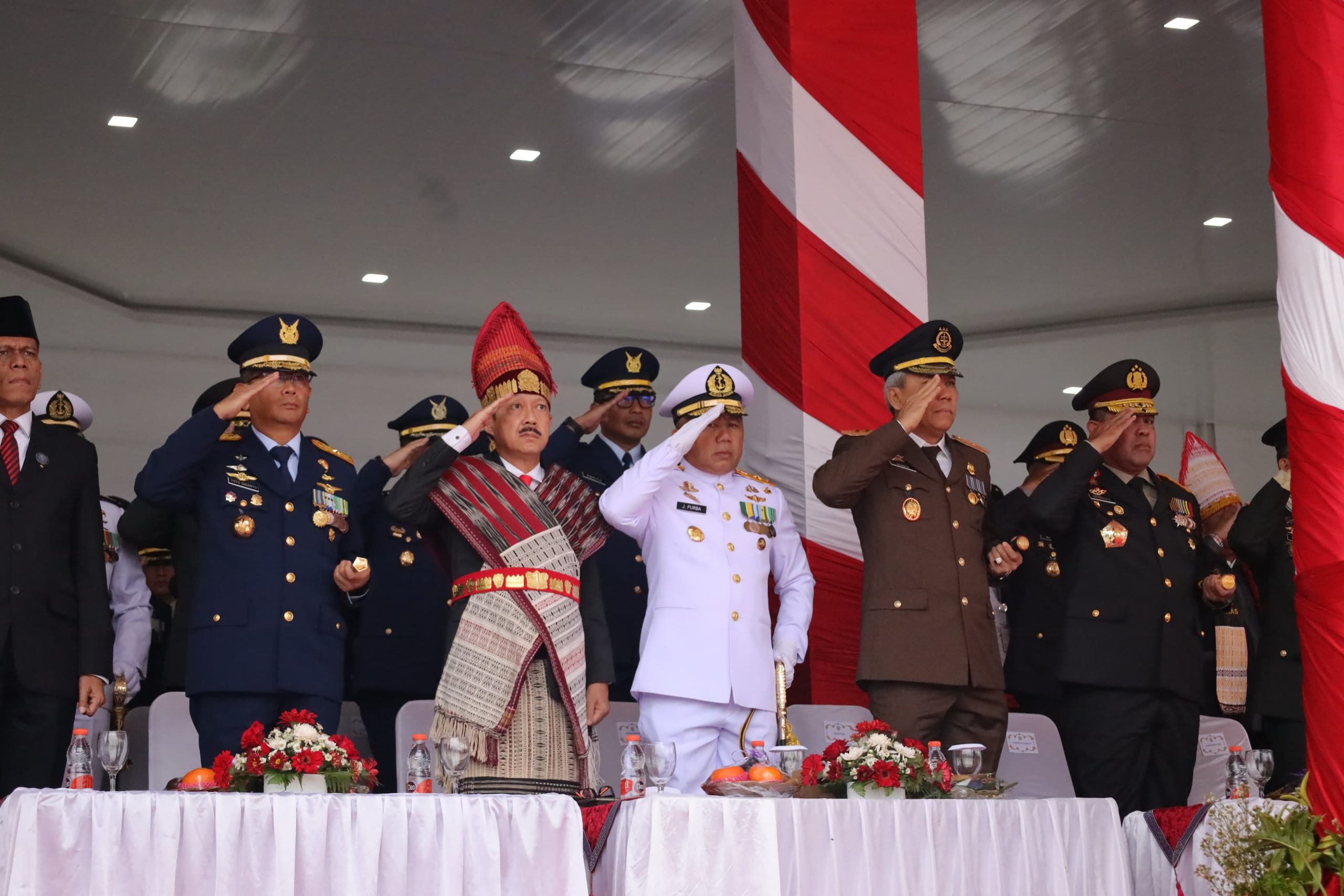 Komandan Pangkalan Utama TNI Angkatan Laut I (Danlantamal I) Brigjen TNI (Mar) Jasiman Purba, S.E., CHRMP., didampingi Ketua Korcab I DJA I Ny. Othy Jasiman Purba beserta Forkopimda Sumatera Utara menghadiri Upacara Hari Ulang Tahun ke79 Kemerdekaan Republik Indonesia Tahun 2024 dengan tema, “Nusantara Baru, Indonesia Maju”, dipimpin oleh Pj. Gubernur Sumatera Utara Drs. Dr. Agus Fatoni, M.Si., bertempat di Lapangan Astaka, Medan, Sumatera Utara, Sabtu (17/8/2024).