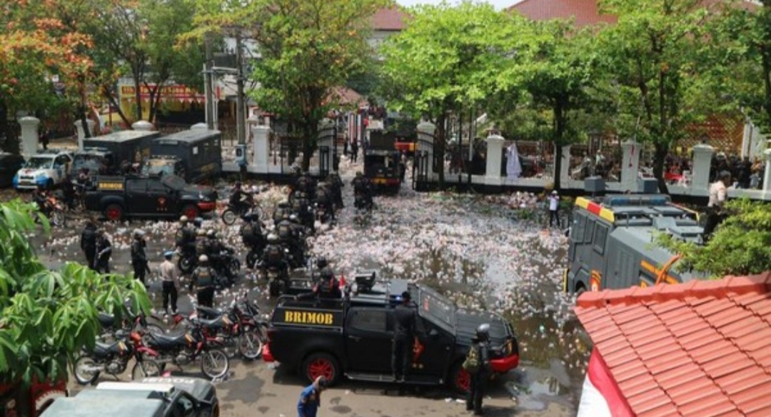 Massa juga mendorong pagar kantor itu dan memaksa masuk ke dalam. Petugas yang berjaga pun kemudian melepas gas air mata ke massa hingga masa kocar kacir.