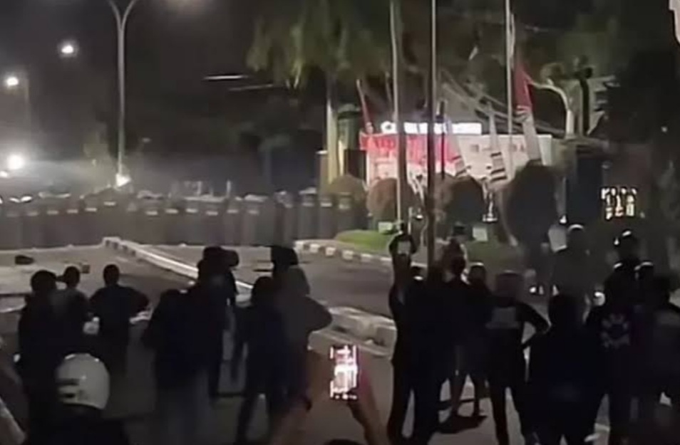 Situasi kian memanas hingga massa melempari aparat dengan batu. Polisi lalu menembakkan gas air mata untuk membubarkan kerumunan.