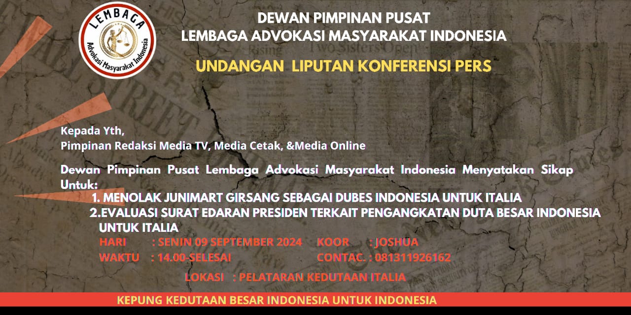 Kami yang tergabung dalam Dewan Pimpinan Pusat Lembaga Advokasi Masyarakat Indonesia mendesak pemerintah Republik Indonesia dalam hal ini presiden Joko Widodo untuk mencabut Kembali SURPRES pengangkatan Junimart Girsang sebagai duta besar Indonesia untuk Italia, Adapun beberapa catatan kritis yang perlu kami sampaikan dalam menjaga pilar demokrasi negara kesatuan Indonesia.