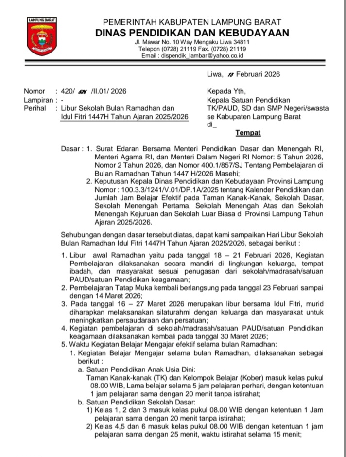 Menurutnya, keputusan tersebut berlaku bagi seluruh satuan pendidikan di wilayah Kabupaten Lampung Barat tanpa pengecualian.