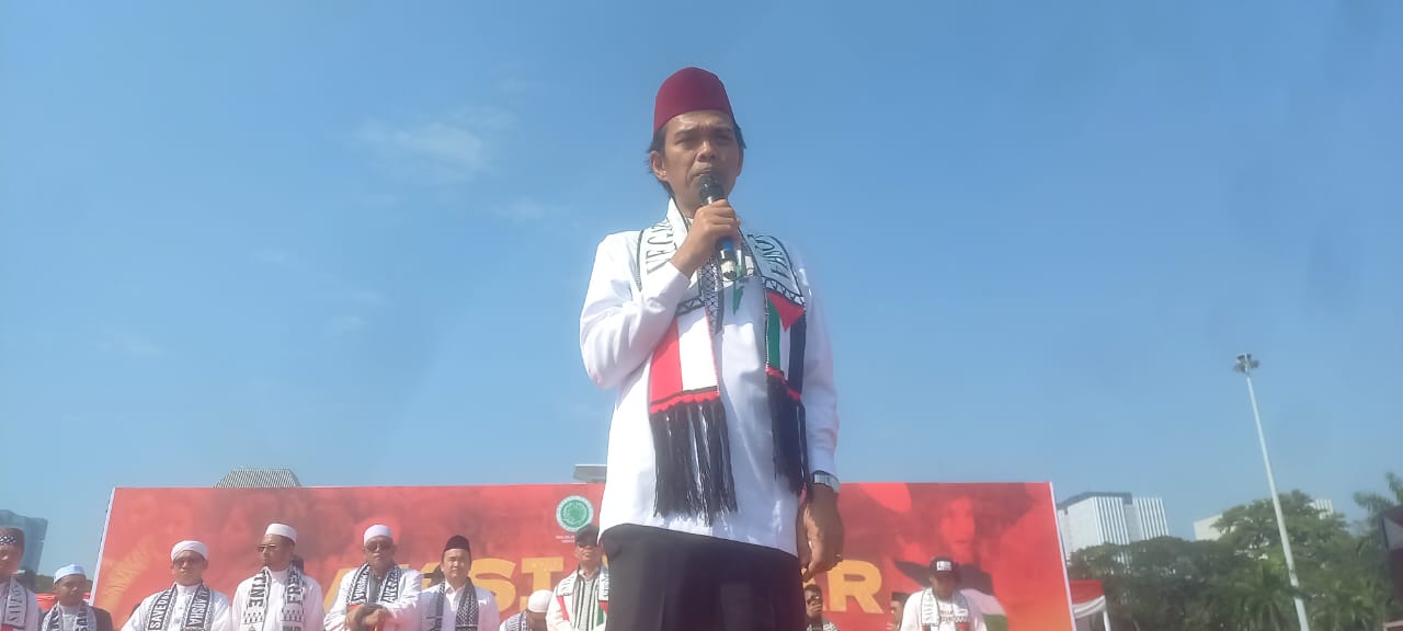 “Tidak perlu menjadi Muslim untuk peduli Palestina. Tidak perlu menjadi mukmin untuk peduli Palestina. Cukup menjadi manusia untuk peduli Palestina,” seru UAS dari atas panggung utama, disambut takbir ribuan peserta.