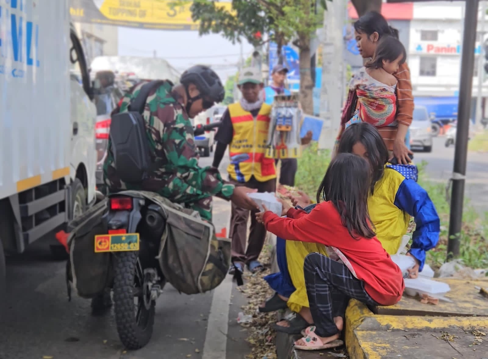 Dengan menggunakan rombong sederhana, Sertu Lilik menyusuri jalan-jalan di lingkungan Jatiraden untuk mendistribusikan makanan kepada warga yang membutuhkan. Kegiatan ini merupakan bagian dari program Jumat Berkah yang rutin ia laksanakan setiap pekan.