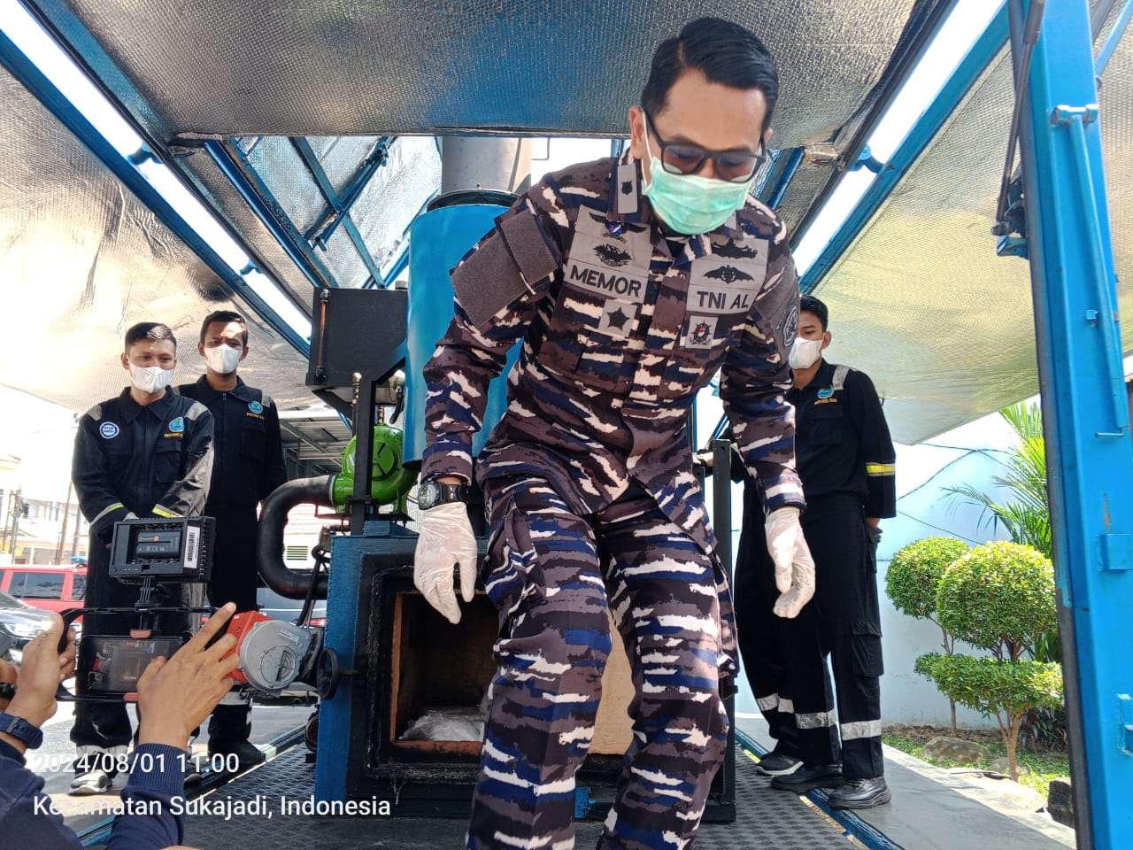Pemusnahan barang bukti Sabu dibakar dengan menggunakan mesin inseminator. Belasan kilogram sabu tersebut disita dari tiga pelaku yang ditangkap di Perairan Selinsing, Kota Dumai.