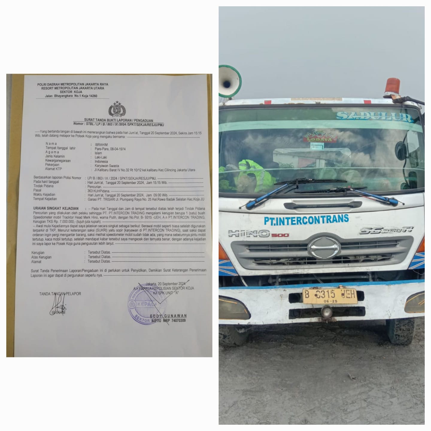 “Awal kejadian truk terparkir di garasi, dan supir (Sukri) saya ingin berangkat dikarenakan ada orderan tetapi setelahnya supir saya melihat speedo meter sudah tidak ada dan langsung melapor ke saya”, tutur Ibrahim.