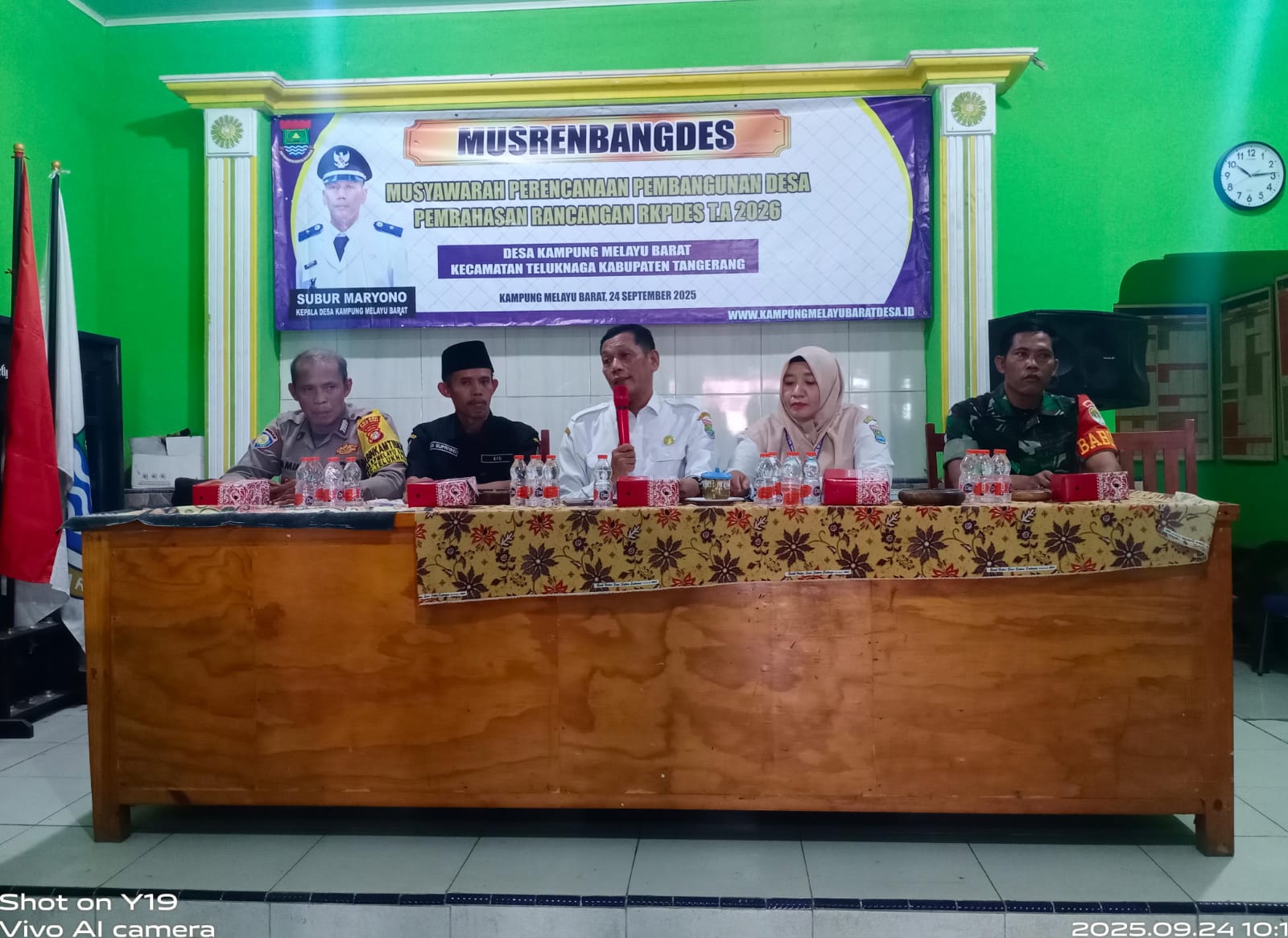 Pemerintah Desa Kampung Melayu Barat, Kecamatan Teluknaga, Kabupaten Tangerang menggelar Musyawarah Perencanaan Pembangunan Desa (Musrenbangdes) untuk membahas Rancangan RKPDes Tahun Anggaran 2026. Kegiatan tersebut berlangsung pada Selasa (24/09/2025) di Aula kantor Desa setempat.