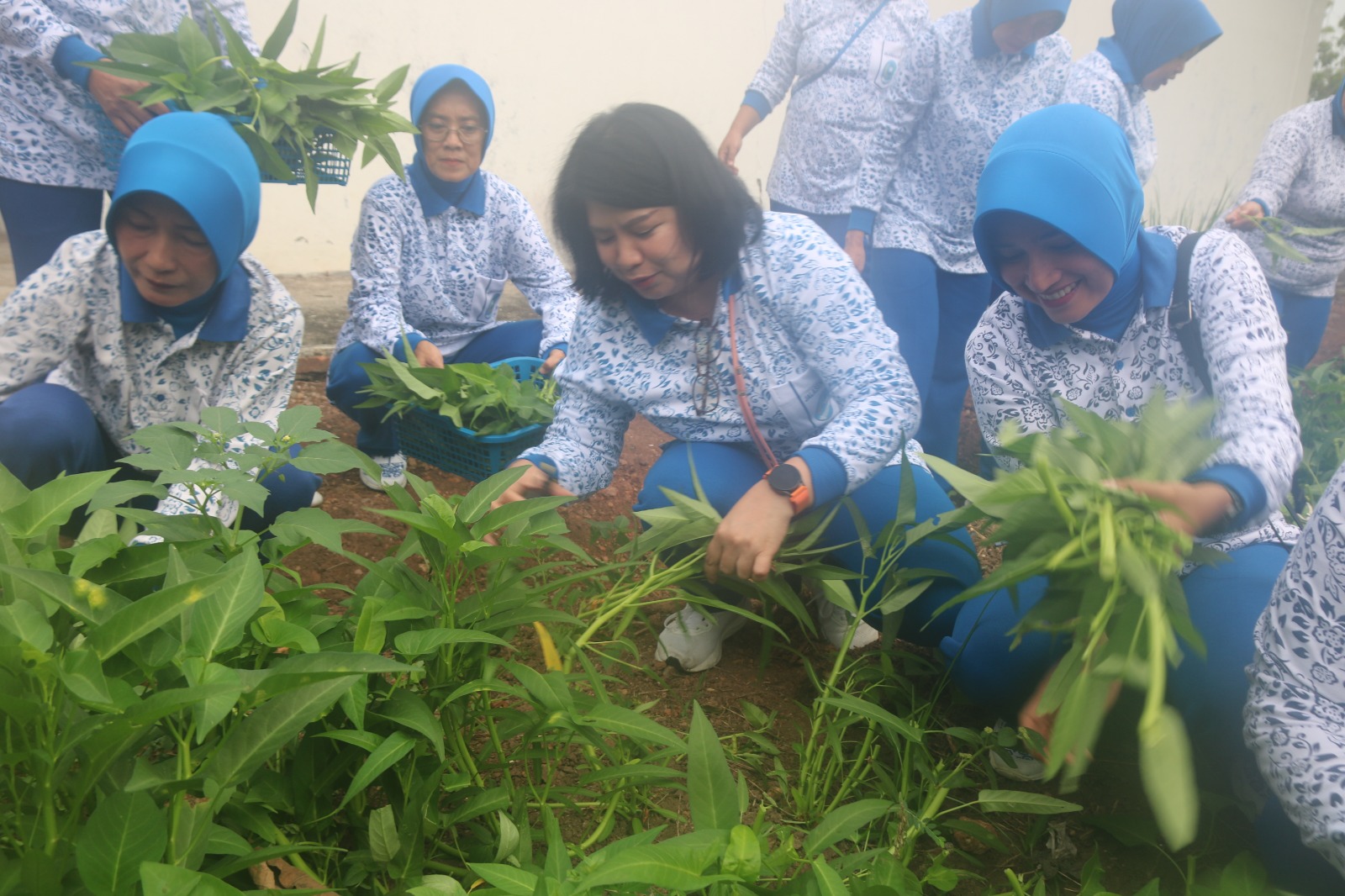 Ketua Cabang 4 Korcab II DJA I Ny. Laura Octo Manurung, memimpin Panen Raya Kangkung di Lahan Ketahanan Pangan Lanal Bengkulu. Kegiatan ini diikuti oleh pengurus Jalasenastri Cabang 4 Korcab II DJA I, Jumat (16/8/2024).