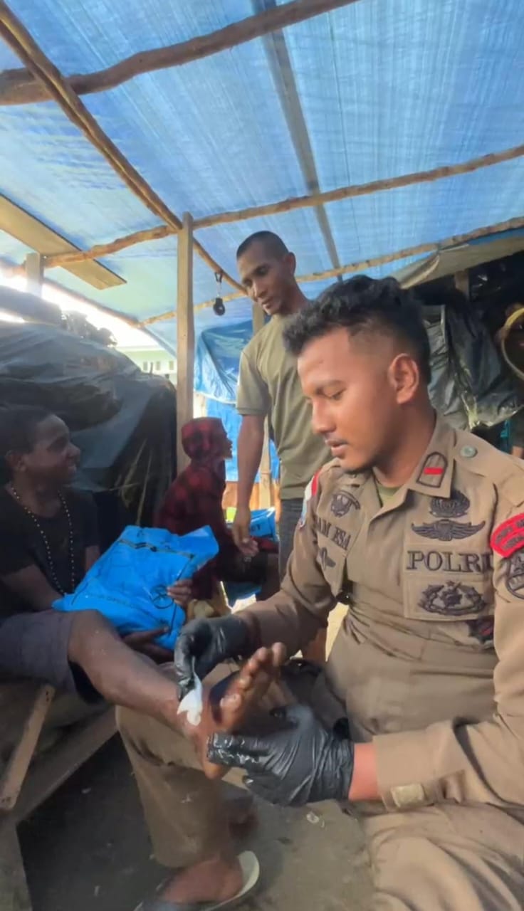 Dalam kegiatan kemanusiaan tersebut, personel Ops Damai Cartenz 2025 dengan sigap dan penuh kepedulian merawat luka anak yang tampak cukup serius.
