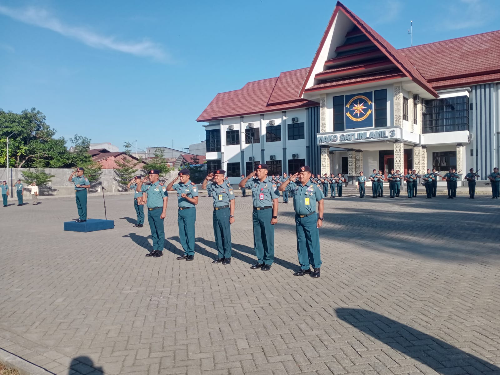 Komandan Satuan Lintas Laut Militer (Dansatlinlamil) 3 Kolonel Laut (P) Nur Rochmad Ibrohim, S.T., M.Si., M.Tr.Hanla., pimpin Upacara Bendera yang digelar tanggal 17 setiap bulan, bertempat di Mako Satlinlamil 3, Jalan Teuku Umar, Makassar, Rabu (17/7/2024).