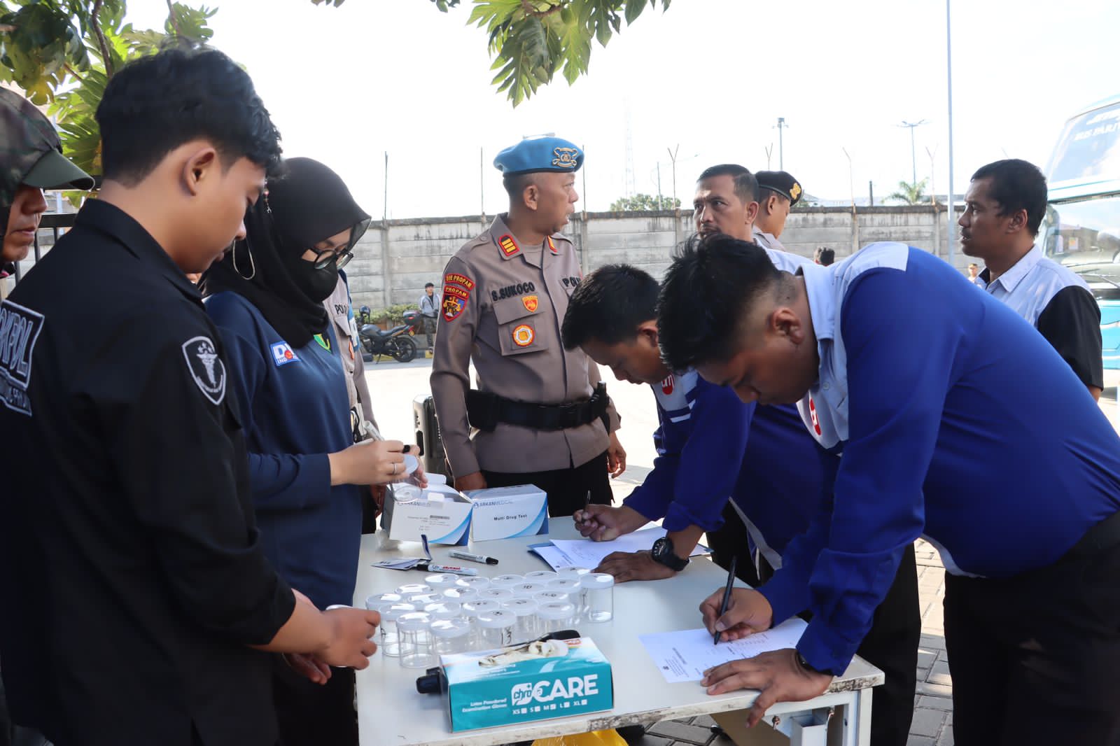 Sebelum dilakukan pemberangkatan Mudik, Seksi Kedokteran dan Kesehatan (Sidokkes) Polres Pelabuhan Tanjung Priok, melaksanakan pemeriksaan kesehatan dan cek urine kepada semua sopir yang mengemudikan Bis Mudik Gratis sebagai untuk menjamin keselamatan pemudik.
