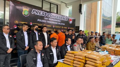 CHAKRANEWS.MY.ID TANGERANG,-Tangerang – Satuan Reserse Narkoba Polres Tangerang Selatan berhasil mengungkap peredaran narkotika jenis ganja sebanyak 140,4 Kg dengan mengamankan tiga (3) orang tersangka yaitu H (laki-laki,27 tahun), G (laki laki umur 26 tahun) dan S (laki laki umur 38 tahun)