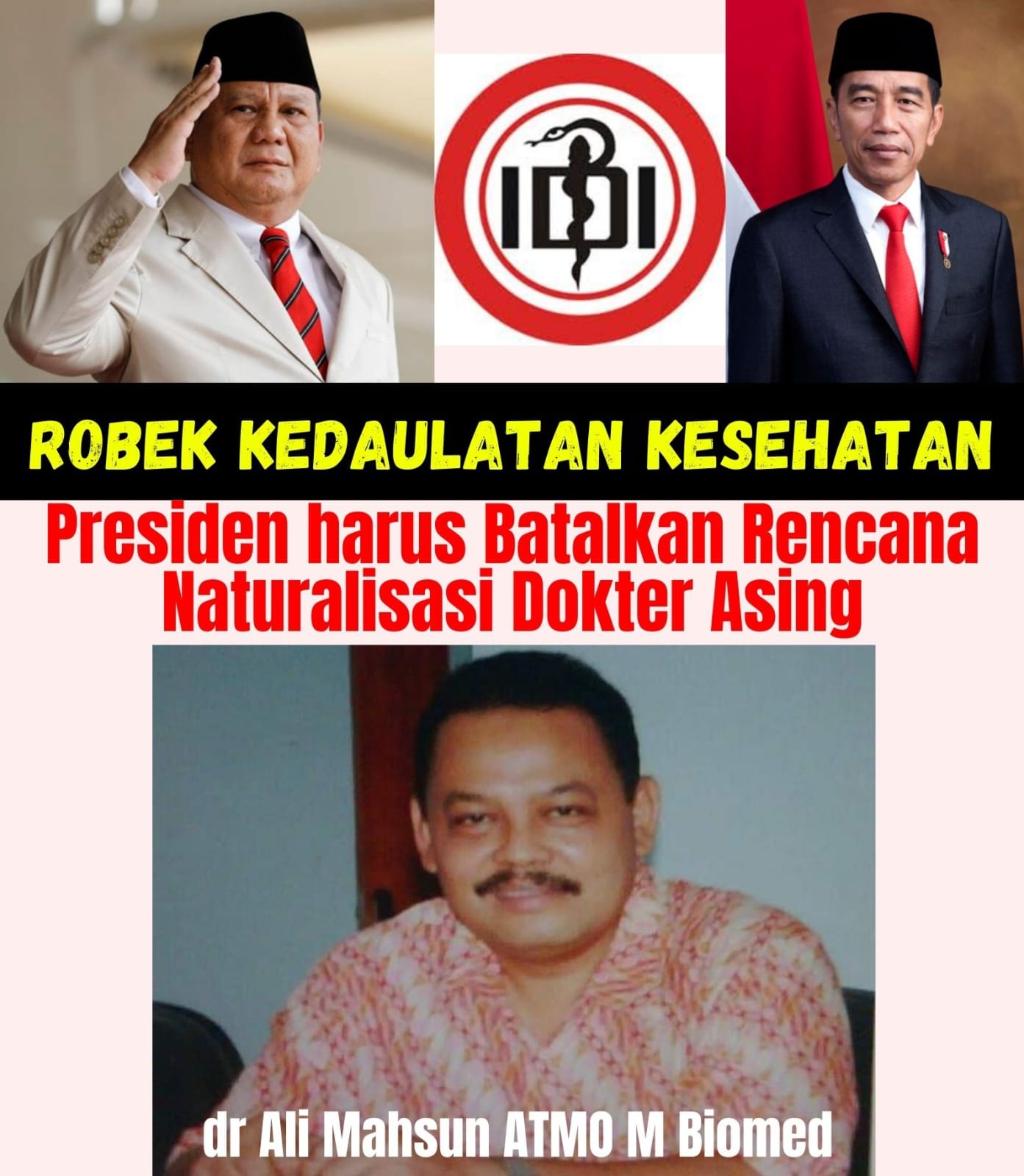 Sebagai seorang dokter, saya juga berharap IDI beserta organisasi dokter spesialis segera ambil langkah emergensi. Segera bertemu Presiden Jokowi dan Presiden RI 2024-2029 Prabowo Subianto. Kenapa? Ini soal kedaulatan kesehatan Indonesia, tidak boleh dirobek atau dijajah oleh siapa pun. Rencana Menkes naturalisasi dokter asing harus dibatalkan oleh Presiden RI, pungkas lelaki sahaja putra asli Mojokerto Jawa Timur mantan Pembantu Rektor V Undar Jombang Jatim..