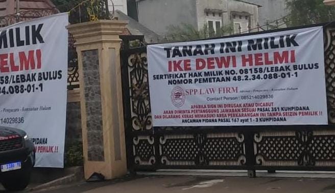 CHAKRANEWS.MY.ID, – Jakarta Selatan -, Selasa 27 Mei 2025 – Sebuah rumah mewah yang berlokasi di kawasan Lebak Bulus, Jakarta Selatan, disegel oleh pemilik sah atas nama Ike Dewi Helmi. Penyegelan dilakukan dengan pemasangan spanduk besar yang menyatakan bahwa tanah dan bangunan tersebut merupakan hak milik Ike Dewi Helmi, berdasarkan Sertifikat Hak Milik (SHM) No. 08158/Lebak Bulus dengan nomor peta 48.2.34.088-01-1.