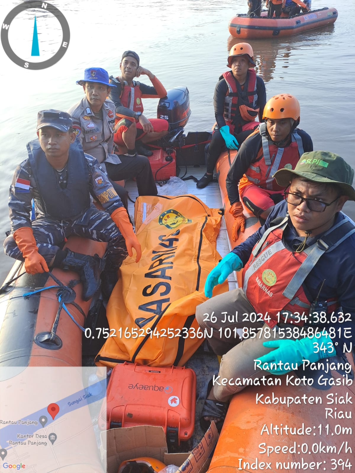 Lokasi penemuan jenazah korban meninggal dunia tidak jauh dari titik hilangnya korban disekitar Perairan Sungai Siak, Desa Rantau Panjang, Kecamatan Koto Gasib, Kabupaten Siak.